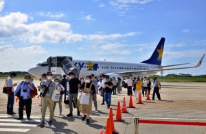 発着枠コンテストのトライアル準備暫定運航として2020年10月から就航がスタートしたスカイマークの羽田-下地島路線。発着枠の期間が2025年3月29日まで継続されることが決まった=2020年10月25日、下地島空港