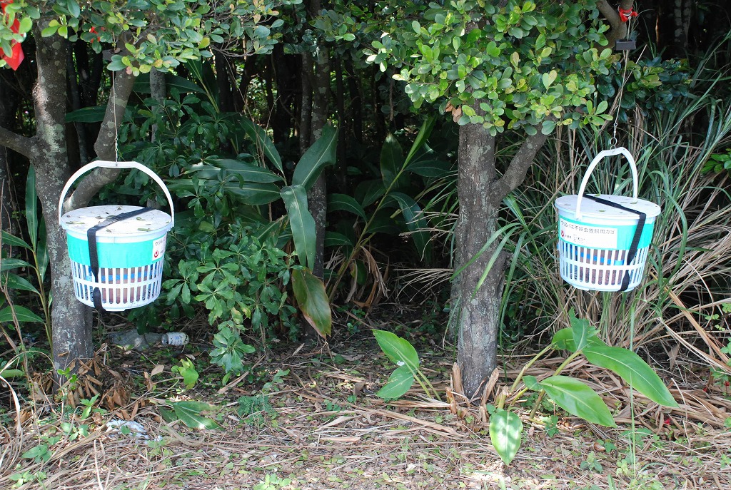 道端の木にぶら下がり人目を引いている「ウリミバエ不妊虫放飼用カゴ」=平良下里