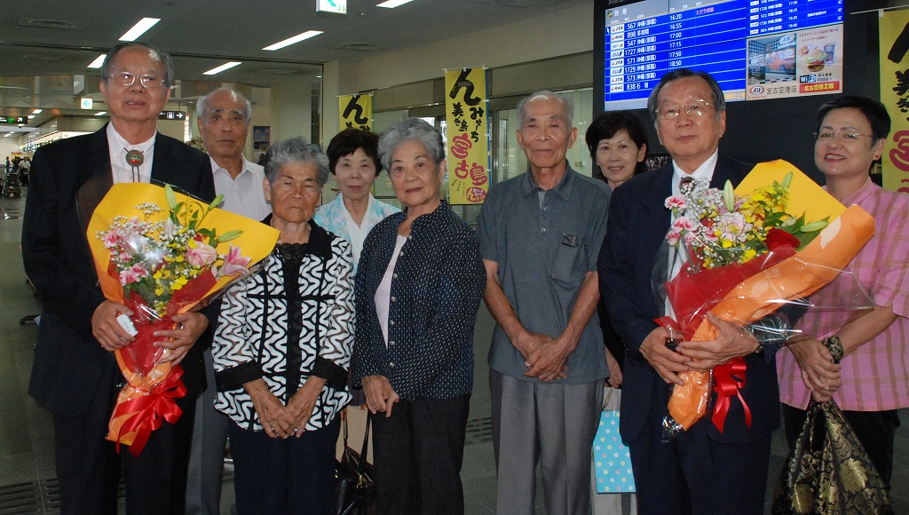 前列左から戴さん、松川さんの長女真栄田さん、次女金城絹恵さん、三男勝行さん、羅さん=日、宮古空港