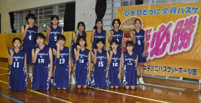 チームワークばっちりの下地小女子ミニバスケットボール部。チームを引っ張る6年生7人と5年生4人、4年生3人、2年生1人の合わせて15人。週に4日、体育館で元気に汗を流す。昨年は冬の地区大会で念願の優勝を果たし、12月の県大会に出場した。