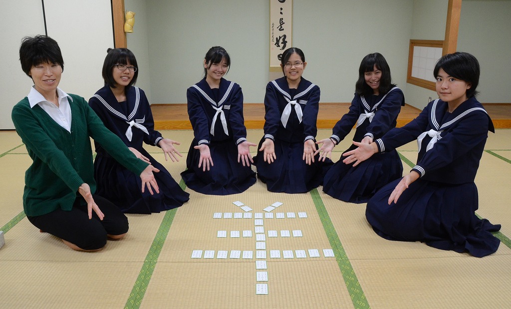 今年、部活に昇格し、大きく飛躍する宮古高校のかるた同好会。かるたの札で「羊」の文字をつくり「ひつじ年」に飛躍を誓う(左から)長塚教諭と戸田さん、宮川さん、下地さん、奥平さん、平良さん=宮古高校