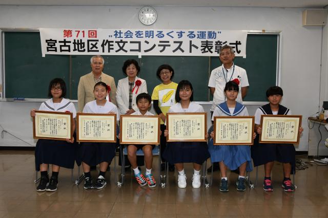 第71回社会を明るくする運動作文コンテスト(主催・同運動宮古地区推進委員会)の表彰式が22日、平良地方合同庁舎で開かれた。最優秀賞を受賞した東小6年の砂川柊斗君と北中3年の宮里美空さんほか、優秀賞、優良賞受賞者に賞状と副賞が贈られた。