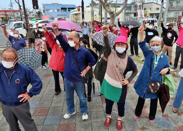 任期満了に伴い24日に投票、即日開票される第5回宮古島市議会議員選挙(定数24)の選挙運動最終日の23日、激しい戦いを展開してきた38人の候補者が街頭で演説などを行い、7日間の選挙戦を締めくくった。打ち上げ式を行った各候補は、支持者の協力に感謝するとともに、「最後の最後まで支援をお願いしたい」と訴え、最後は勝利に向けて「ガンバロー三唱」を行い気勢を上げた。