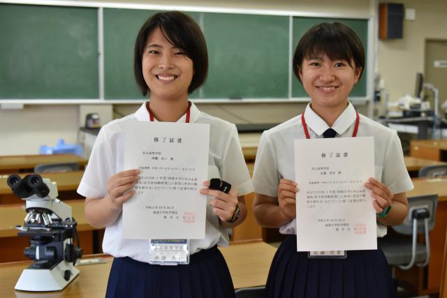 【那覇支社】琉球大学(西田睦学長)は23、24の両日、医学部を目指す高校生を対象とした2021年度「琉球大学にぬふぁ星講座(医学部体験授業)」を行った。24日は、筒井正人医学部長から、参加した宮古高校1年の洲鎌あいさんと近藤花音さんの2人を含む県内高校生15人に修了証書が授与された。