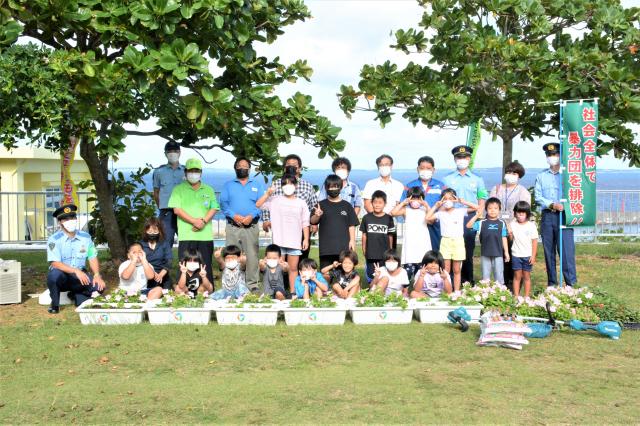 宮古かぎすま安全なまちづくり推進協議会(市長、座喜味一幸会長)は25日、池間添の児童公園で環境美化による地域防犯活動として、池間添自治会(上地繁喜会長)へ花のプランター贈呈した。同会の副会長である宮古島警察署の田場義浩署長らから上地会長へ、ベコニアなどの花が贈られた。