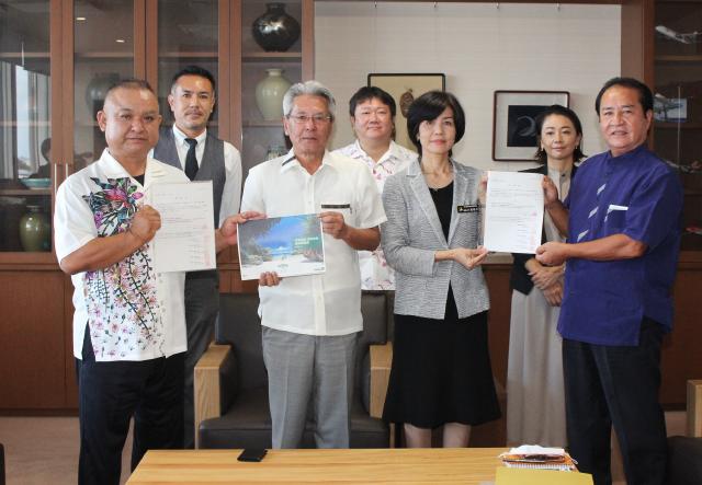 廃校となった伊良部小、中学校を利活用して地域の活性化を目指しているパニパニエンタテインメント(久貝博義理事長)は25日、市役所に座喜味一幸市長と大城裕子教育長を訪ね、用地の賃借と施設の無償譲渡を要請した。よしもと興業と連携し、エンタテインメントに特化したクリエーターを養成する学校法人の設立を構想しているといい、構想に賛同した国仲、仲地、伊良部、長浜、佐和田の南区5自治会との連名で要請した。