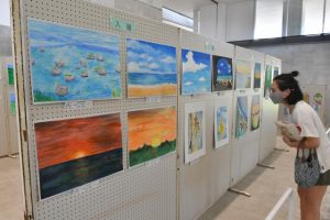 宮古ライオンズクラブ(富山忠彦会長)の第27回中高生絵画コンクール展示会が26日、市未来創造センター市立図書館で始まった。来館した市民らが足を止めて、生徒たちの力作に見入っていた。期間は29日まで。