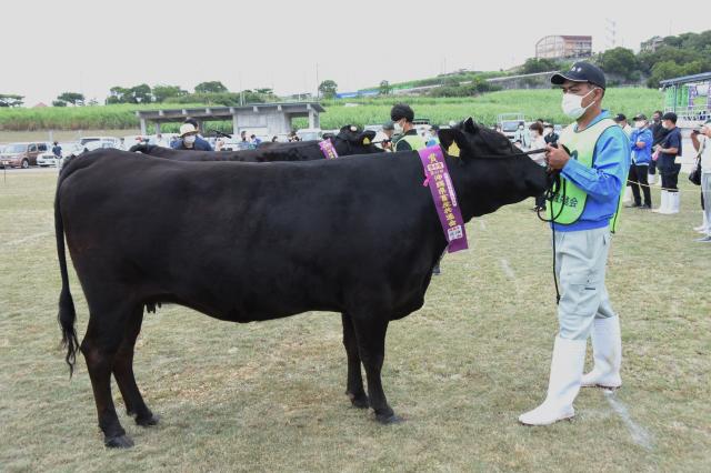 【那覇支社】第47回県畜産共進会(主催・県畜産共進会協議会)肉用牛の部が5日、糸満市の南部家畜市場で開催され、荷川取広明さん=市下地高千穂=所有の「りょうこ」号が成雌第2類で優秀1席(1位)となり、農林水産大臣賞と県知事賞を同時受賞した。宮古島市からの大臣賞は4年ぶり。同市は、出品5頭中4頭が入賞し、初の団体賞に輝いた。