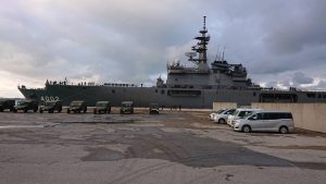陸上自衛隊宮古島駐屯地の保良訓練場(弾薬庫)に配置する誘導弾を搭載したとみられる海上自衛隊の輸送艦が平良港に到着した。