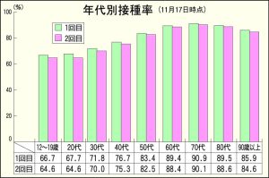 2回目接種済み者を年代別にみると、最も多いのは70代の90・1%で、次いで▽80代88・6%▽60代88・4%▽90歳以上84・6%▽50代82・5%-。50代以上は80%を超えている。