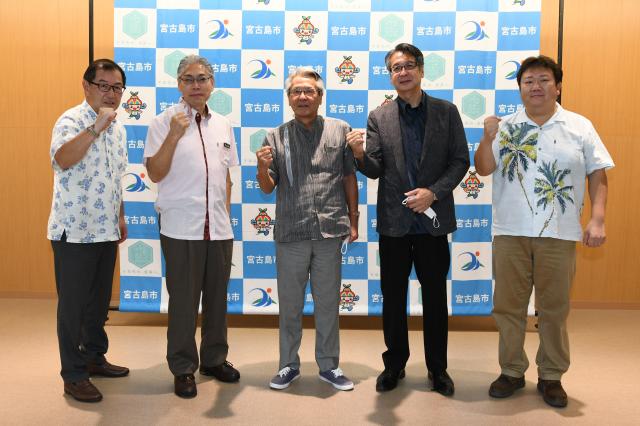 同協議会は新型コロナの影響でオンライン会議が続いていたが、今回約1年ぶりに宮古島で対面形式での開催となった。そこで会議の冒頭、委員5人(代理参加者含む)で記念撮影を行い、今後さらに委員が一丸となって各種事業の取り組みを推進することへの思いを新たにした。