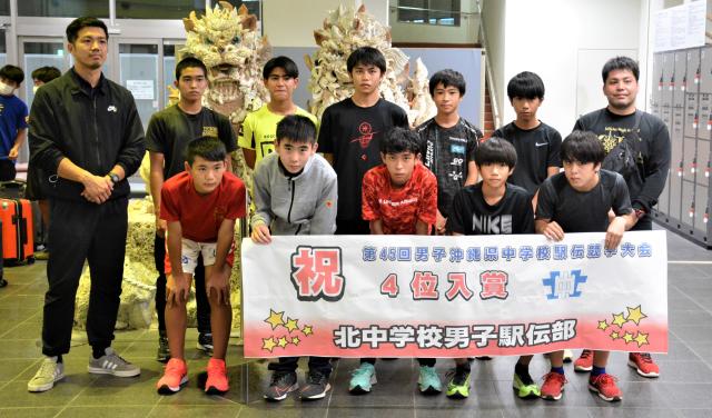 第45回男子、第34回女子県中学校駅伝競走大会(主催・県中学校体育連盟など)が20日、島尻地区中体連駅伝コースで行われ、北中学校男子が4位に入賞し生徒たちが同日帰島した。宮古空港では、保護者や学校関係者が横断幕を掲げて出迎え健闘をたたえた。