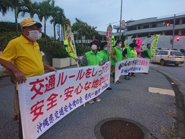 県交通安全母の会宮古支部(島尻清子支部長)は26日、交通ルールと運転マナーをドライバーらに呼び掛ける活動を主要道路で実施した。メンバーら約20人が参加し、交通事故のない安全、安心な宮古島を訴えた。