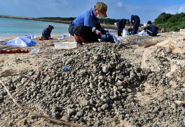 同漁協によると、この日は2カ所の海岸から7~8㌧の軽石を土のう袋に入れて撤去した。