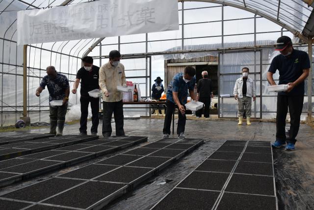 【多良間】村葉たばこ振興会(羽地健総代)は11月30日、JAおきなわ多良間支店葉たばこ育苗施設で播種(はしゅ)式を行った。伊良皆光夫村長をはじめ、村議会議員、JAおきなわ多良間支店職員らが参加し、全員で2022年産の豊作を祈願して種をまいた。