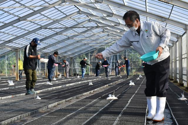 城辺地区の播種式は、城辺の育苗ハウス前で行われた。開始セレモニーを終えると、ハウス内に移動し、小さな種を混ぜ合わせた砂を苗床に丁寧にまいた。
