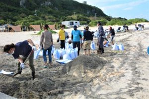 来間漁港に隣接するビーチに大量の軽石が漂着している問題で、観光関連業者などは9日、ボランティアで除去作業を実施した。手作業で行われ、トン袋の35~40袋を拾い集めた。