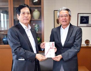 海事代理士の新垣盛雄さん(73)=平良東仲宗根=が13日、市役所を訪ね、日本赤十字社沖縄県支部宮古島市地区長の座喜味一幸市長に活動資金として100万円を寄付した。