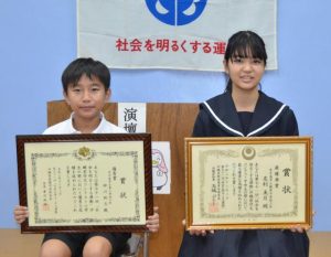 第71回県社会を明るくする運動作文コンテストの表彰式が17日、平良下里の更生保護サポートセンターで行われ、中学生の部最優秀賞に輝いた友利美月さん(鏡原中3年)、小学生の部優秀賞に選ばれた砂川柊斗君(東小6年)に賞状が伝達された。作文を朗読した2人は「皆で支え合いながら明るい社会にしよう」と訴えた。
