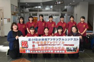 第46回県アンサンブルコンテスト(主催・県吹奏楽連盟など)は19日、うるま市民芸術劇場で行われ、北中学校吹奏楽部の打楽器アンサンブルと、金管アンサンブルが金賞を受賞した。打楽器アンサンブル(下地伽弥、長田茜愛、目取真千遥)は県代表に選ばれ、九州大会への切符を手にした。メンバーは20日帰島し、宮古空港で出迎えた保護者や学校関係者から盛大な祝福を受けた。