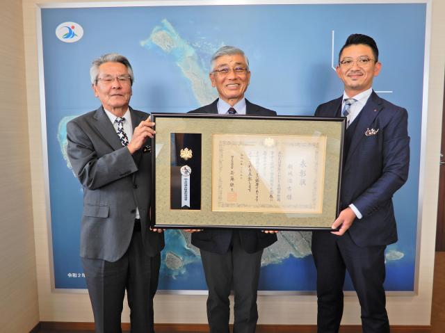 自動車関係功労者等に対する「2021年国土交通大臣表彰」を受賞した「東和」の新城浩吉会長と新城浩司代表が22日、市役所に座喜味一幸市長を訪ね、受賞を報告するとともに電気自動車(EV)の状況などについても意見を交わした。