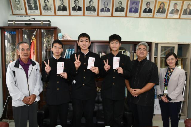 「神のバトン賞」や「伊藤園お~いお茶新俳句大賞」で入賞した狩俣中学校(平良満洋校長)の川満歩夢さん(2年)、國仲秀弥さん(3年)、砂川琉悟さん(2年)に22日、狩俣学区体育協会会長OB会(狩俣武志会長)から激励金が贈られた。