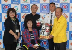 身体障害者総合支援施設青潮園(平良下里)の利用者の佐久川博子さん(57)が23日、宮古島警察署を訪ね、手作りした「宮古島まもる君、まる子ちゃん」の人形を贈った。「私が作った人形を飾ってくれるというのでうれしい。お互いに交通安全に気を付けまし 身体障害者総合支援施設青潮園(平良下里)の利用者の佐久川博子さん(57)が23日、宮古島警察署を訪ね、手作りした「宮古島まもる君、まる子ちゃん」の人形を贈った。「私が作った人形を飾ってくれるというのでうれしい。お互いに交通安全に気を付けましょう」と話した。ょう」と話した。