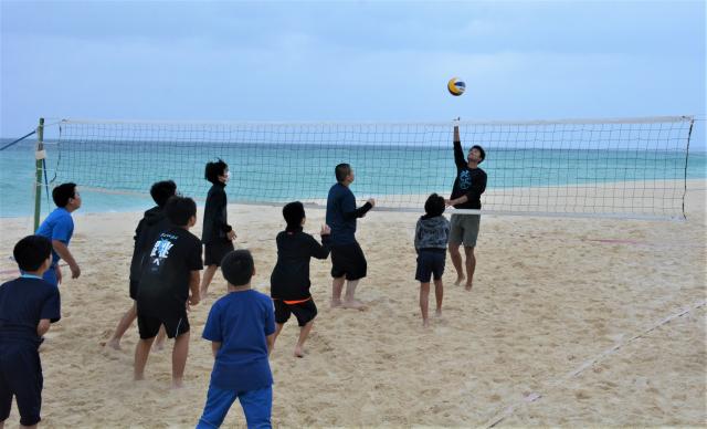 宮古島出身のビーチバレーボール選手で、国内ランキング10位の平良伸晃さん主催によるビーチバレー教室が25日、下地与那覇の前浜ビーチで開かれた。午前中は小学生を対象に行われ、参加した児童たちは平良さんの指導を受けた後、ミニゲームを行い交流を深めた。午後からは中学生を対象に同教室が実施された。