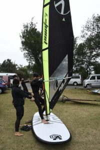 関東学院大学ウインドサーフィン部と宮古島ウインドサーフィンクラブは25日から2日間の日程で、下地の与那覇湾(通称サニツ浜)を会場に高校生を対象としたウインドサーフィン教室を開催。初日は宮古高校の1年生2人が参加し、ウインドサーフィンの基本を学び、サーフィンに乗る体験を行った。