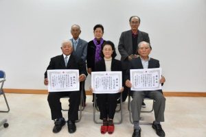 第58回県老人クラブ大会の表彰伝達式が27日、平良老人福祉センターで行われた。老人福祉事業の振興に貢献したことが評価された。新城文雄さんら3人に、老人クラブ育成功労者表彰が贈られた。