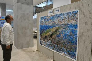 「海族(かいぞく)まつりフィナーレ」モザイクアート・チビッ子海の絵コンテスト作品展が7日、市未来創造センターブラウジングコーナーで始まった。モザイクアートや子供たちの絵画約200点が展示されている。訪れた市民が時折足を止めて、モザイクアートや子供たちの力作に見入っていた。期間は20日まで。