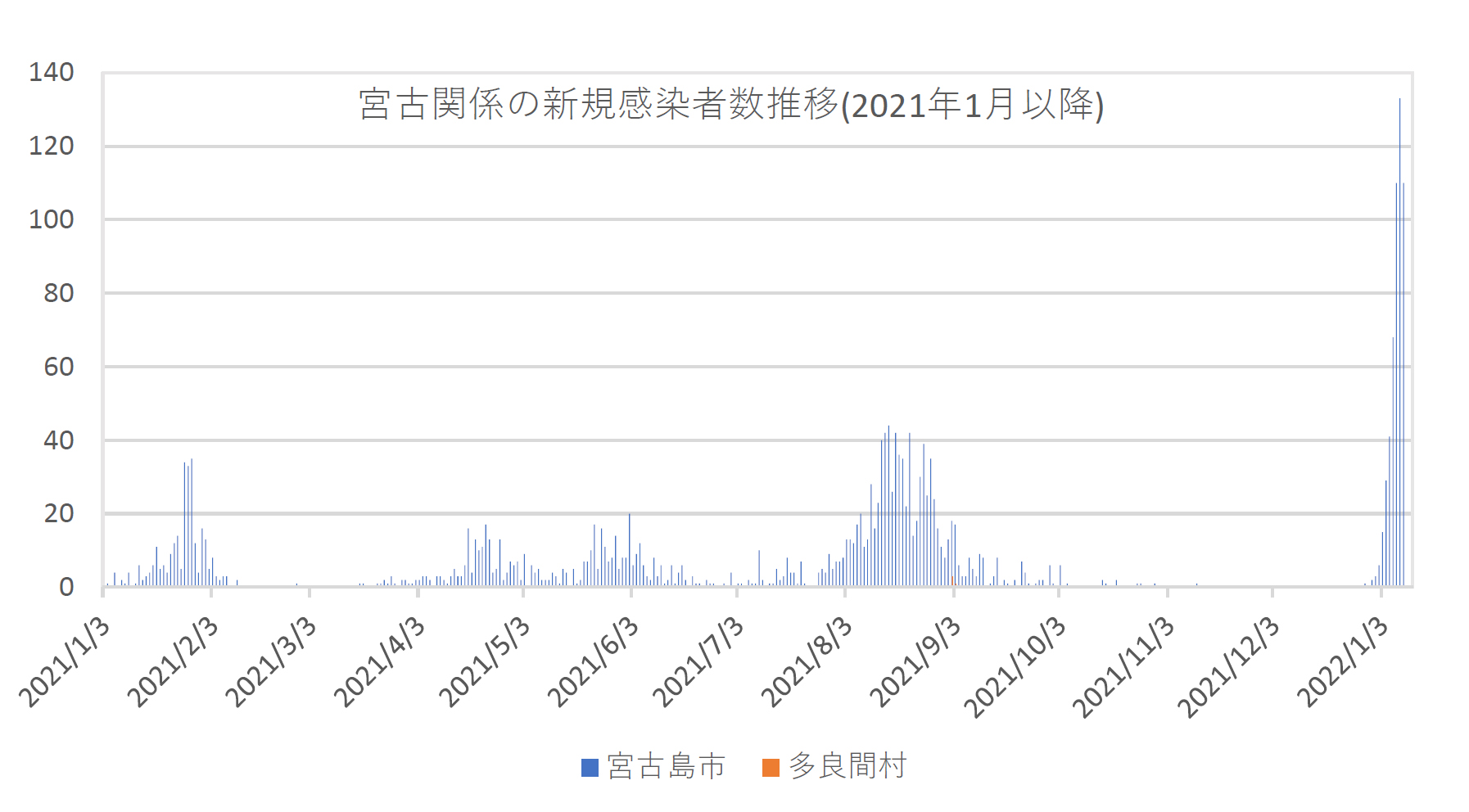 【那覇支社】県は9日、宮古島市で新たに110人が新型コロナウイルスに感染したと発表した。多良間村では陽性者は確認されなかった。県全体でも、前週の同じ曜日から約30倍増の1533人が新たに感染したことも明らかにした。直近1週間の新規感染者数(人口10万人当たり)は、宮古島市926.32人で、県内11市で最多の感染状況となった。