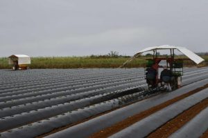 葉タバコの苗を育苗ハウスから本畑に植え付ける作業が13日、市内の一部地域で始まった。上野地区の畑では、生産農家が管理作業車に乗って作業する姿が見られた。県の目標である反収(10㌃当たりの収量)226㌔の達成に向けて、各地の生産農家が本畑での栽培に取り組む。