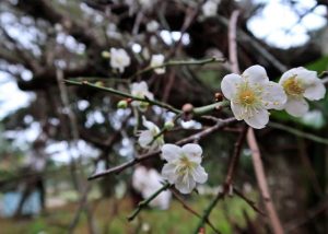 西城小学校(国仲克紀校長)の校庭にある梅(台湾小梅)の花が咲き始めている。13日には時折降る冷たい雨に打たれながら、小さな白いかれんな花が北風に揺れていた。