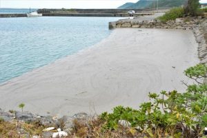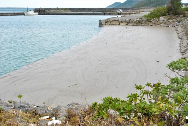 小笠原諸島の海底火山の噴火による軽石が昨年11月から宮古島市各地の海岸に漂着しているが、年を明けても漂着し続けている。浦底漁港では12日、前日の強風の影響もあるのか、海面を大量の軽石が覆っていた。地域の住民は市へ対応を訴えていた。