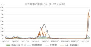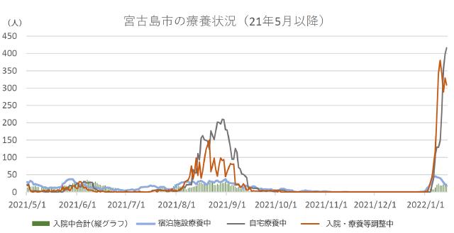 新型コロナウイルスの変異株「オミクロン株」による感染が急拡大する中、宮古島市では入院せず自宅で療養する感染者が14日、400人を超えた。年明けにはゼロだったが感染急拡大に伴って、わずか2週間で自宅療養者が416人に達した。14日時点で入院か自宅療養かの調整中も309人おり、合わせて700人超が病院や宿泊施設ではなく、自宅にとどまっている。これに入院・宿泊施設を加えた療養者は767人になる。