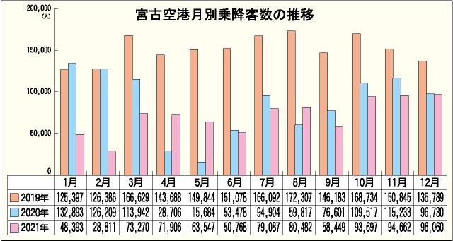 最も少なかったのは2月の2万8811人。次いで1月の4万8393人。宮古島では1月下旬から新型コロナ感染者が増加、高齢者福祉施設でクラスターが発生し、陸上自衛隊災害派遣部隊が医療支援のため宮古に派遣されたことが全国ニュースで報じられるなど、感染拡大の状況が広く伝えられたことなどが来島者減少の要因と見込まれる。