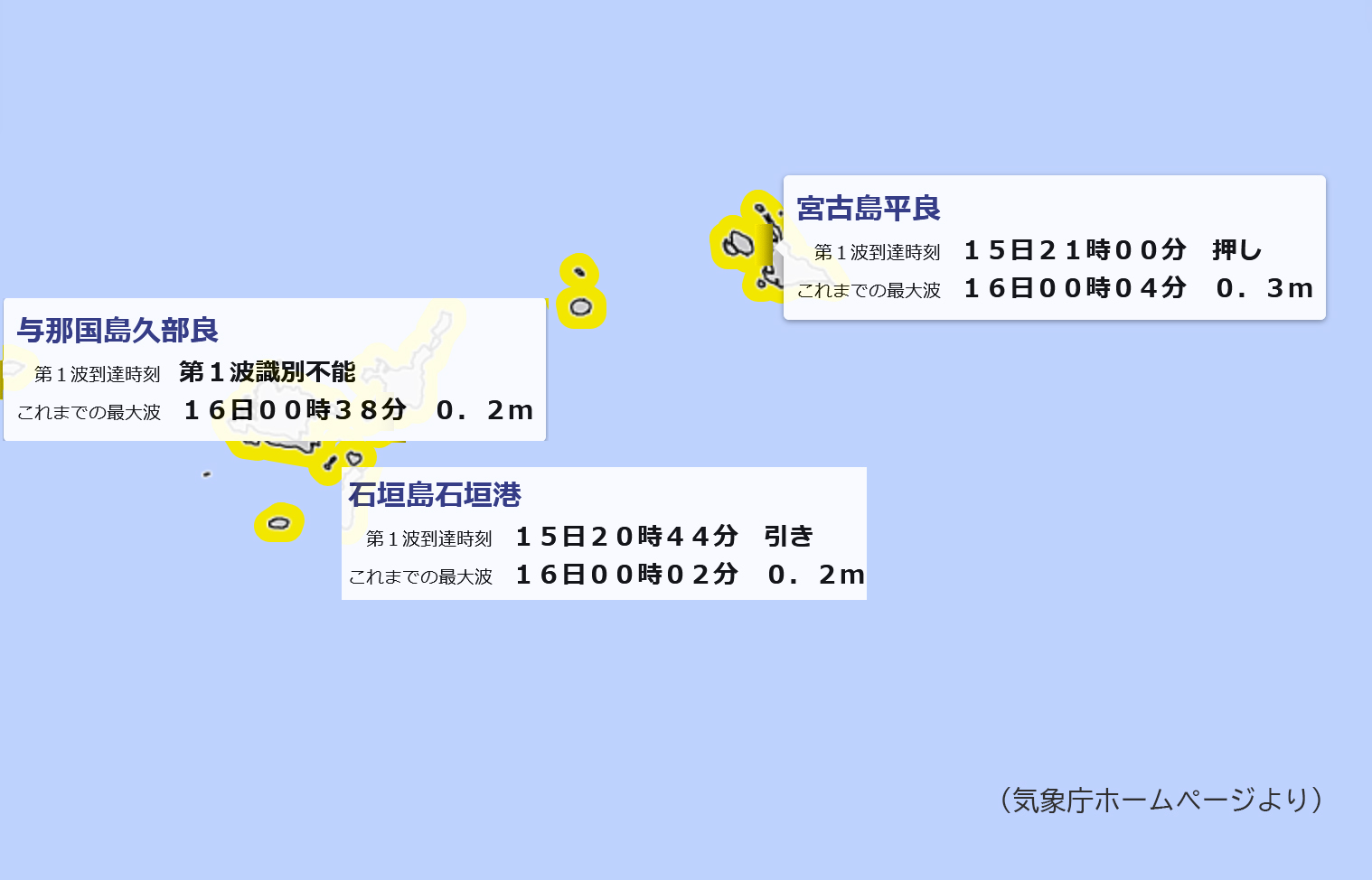 16日午前0時15分、宮古島地方に津波注意報が発令された。同日午前1時現在、宮古島市平良では最大30センチの津波が観測されている(同日午前0時4分)