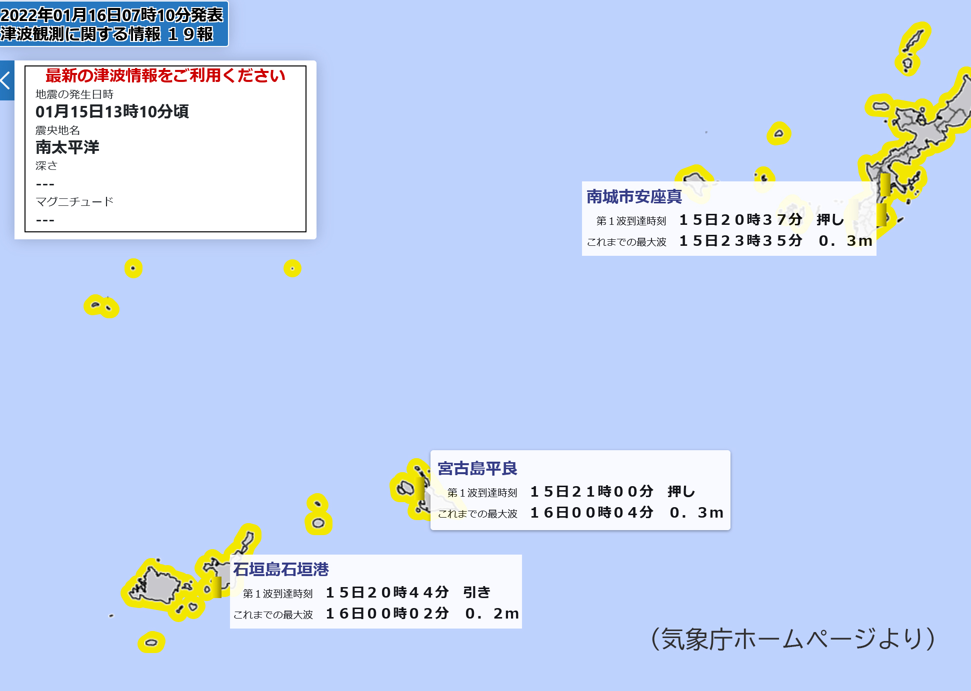 【津波情報続報】宮古島地方には津波注意報が発令されています(16日午前8時時点)