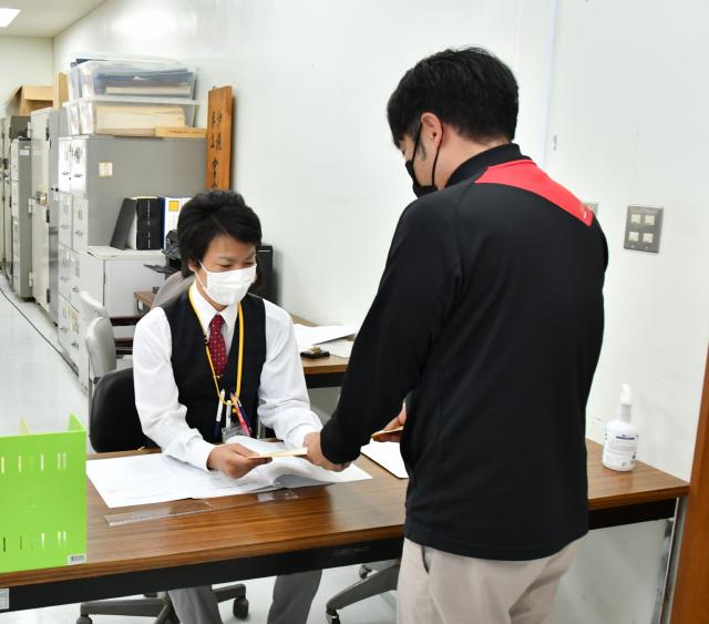 2022年度県立高校の推薦入学の願書受け付けが17日から各高校で始まった。宮古地区の高校では担当教諭らが訪れ、入学願書などを提出。高校側の担当者からチェックを受けた。受け付けは18日まで。内定者は28日までに決定し各学校を通じて通知される。宮古高校は郵送受け付けとなった。