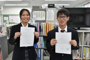 宮古総合実業高校(大山正吾校長)の生物生産科3年の生徒2人がこのほど、琉球大学と国家公務員試験に合格した。仲間朝陽さんが琉大農学部亜熱帯農林環境科学科に合格、下里鈴音さんが国家公務員試験(区分・農業土木)に合格した。同校からの琉大合格者は3年連続。2人は18日、同校で合格の喜びを語った。