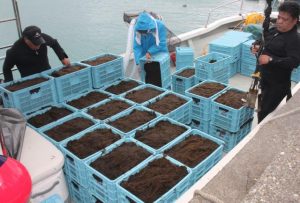 池田さんらはこの日、雨まじりの天気だったが、漁船に4人が乗り込んで午前7時ごろ出港。大浦湾内に張られた養殖網から吸引ポンプを使って収穫した。