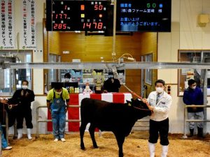 【多良間】JAおきなわ多良間家畜市場の2022年初競りが19日、行われた。畜産農家や関係者らが出席し、畜産振興の拡大と肉用牛の高値取引を祈願した。初競りでは「1番牛」として登場した東風平正明さん所有の去勢「福華春」号が147万8000円(税込み価格162万5800円)の高値を付けた。