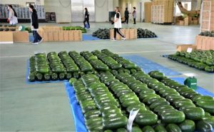 収穫されたトウガン、カボチャ、メロンなどが22日、生産者からJAおきなわ宮古地区農産物集出荷施設へ集荷され、パートの女性たちが箱詰め作業に精を出していた。ここ数日、曇天や雨天が続いており、集荷量は少ないが、これからピークを迎えるという。