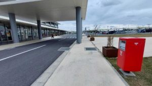 昨年1月4日に開庁した市役所の新庁舎。業務スタート当初から懸案事項だった郵便ポストが市役所の駐車場にこのほど設置され、投函(とうかん)が可能になっている。
