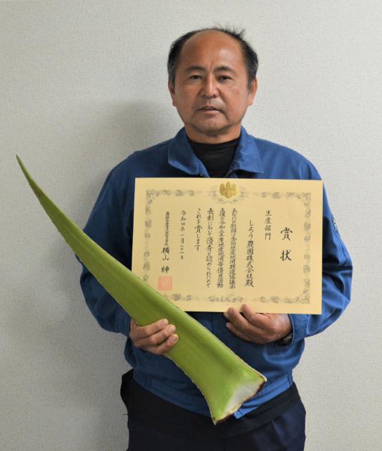 アロエベラを栽培し6次産業化に取り組んでいる上野宮国の「しろう農園」(砂川勇人代表)はこのほど、全国地産地消推進協議会主催の2021年度地産地消等優良活動表彰の生産部門で大臣官房長賞を受賞した。砂川代表は22日、同社事務所で「アロエベラが宮古の基幹作物になるように頑張っていきたい」と抱負を語った。