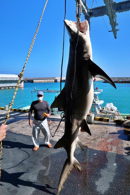 伊良部漁協の組合員らで構成する佐良浜漁業集落が離島漁業再生支援交付金を活用して実施している2021年度のサメの駆除が27日行われ、体長約2㍍50㌢、体重142㌔のどう猛な大物メジロザメなどが駆除された。このメジロザメは今期、同集落が駆除した中で最も大きな個体だという。