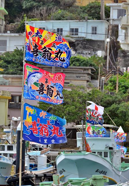 佐良浜漁港では、色鮮やかな大漁旗がはためく中、行き交う人たちからは「今年は盛大に祝いたかったのに残念。いつになったら旧正月を盛大に祝えるのかね」などの声が聞かれた。
