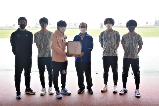 佐川急便を中核とした総合物流企業のSGホールディングス(本社・京都府、栗和田榮一社長)陸上競技部の選手4人が、宮古島で合宿を行っている。市スポーツ協会(砂川恵助会長)は3日、市陸上競技場で選手たちの次大会での活躍を期待して激励会を開いた。砂川会長から同部の西川雄一朗コーチへ宮古島特産の黒糖が手渡された。