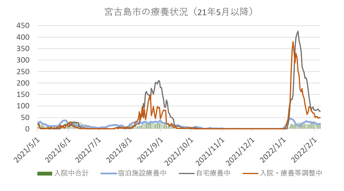 市内で入院中の患者は、宮古病院に入院中患者11人(中等症6人、軽症5人)と、民間病院の軽症者7人の計18人。同日時点の確保病床数は70床で、病床使用率は25.71%。そのほか、宿泊施設療養中が22人、自宅療養中が76人、入院・療養等調整中が49人。